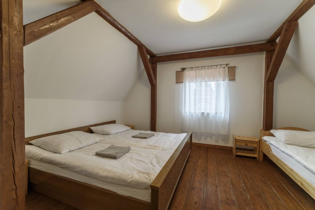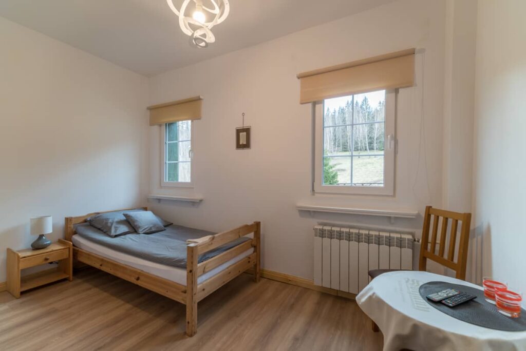 Pokój typu studio rodzinne. Dwa pokoje 2-osobowe połączone korytarzem. Pokój nr 11 – 2 łóżka pojedyncze Pokój nr 12 – łóżko dwuosobowe Prywatna łazienka oraz lodówka i czajnik w pokoju nr 12.