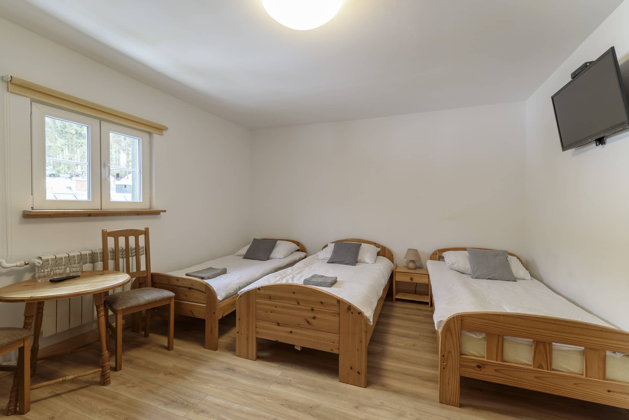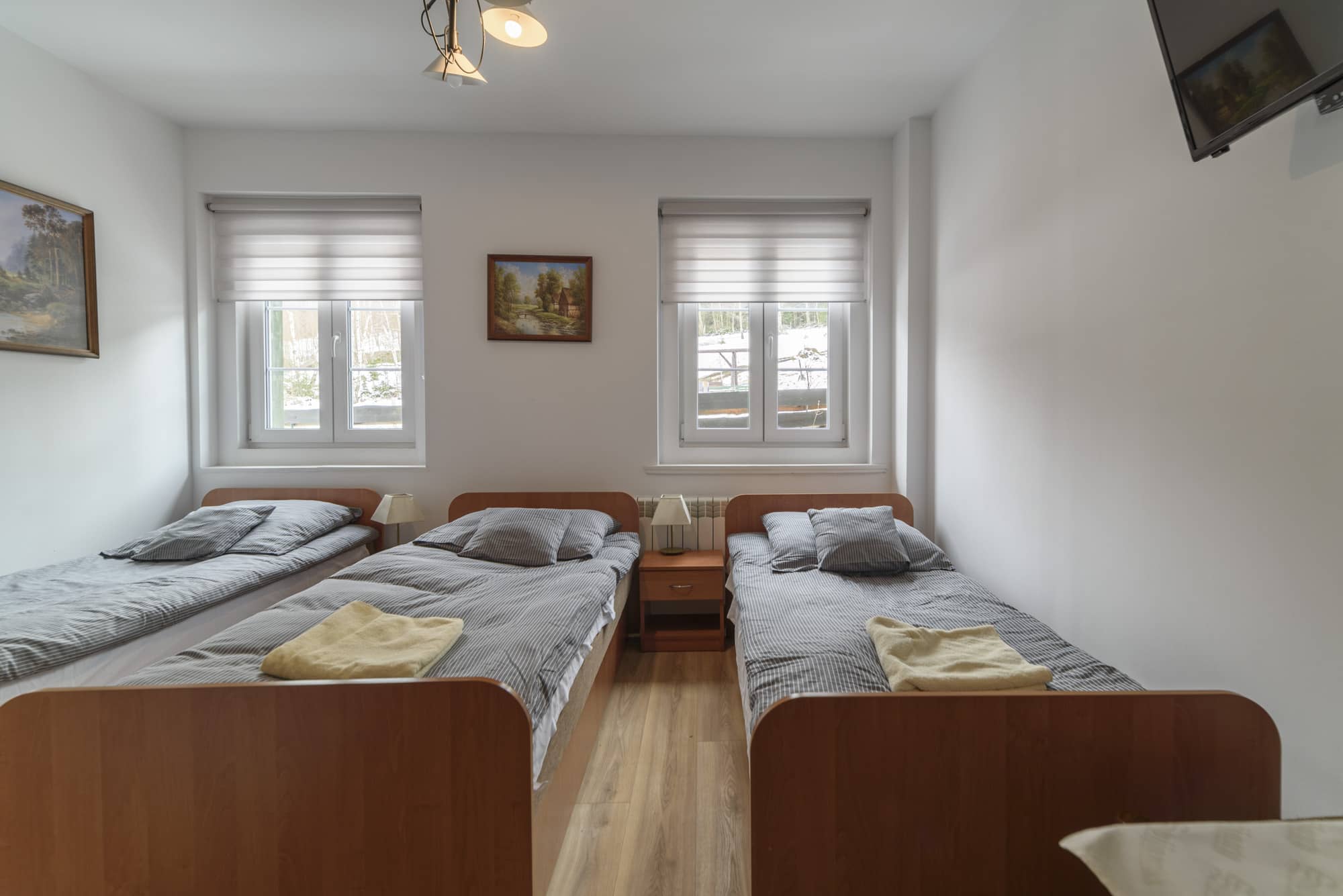 Pokój 3-osobowy (1 łóżko dwuosobowe i 1 łóżko pojedyncze). Prywatna łazienka i telewizor, czajnik i lodówka.